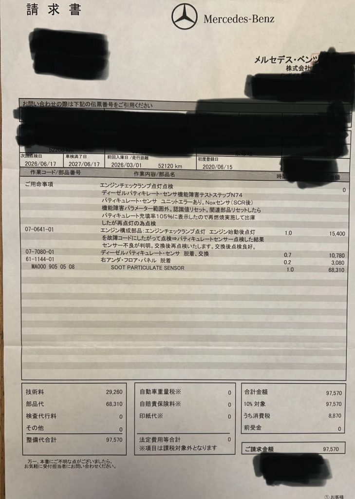その際の請求書が以下です。覚悟はしていたものの、10万近い金額になりました。こういうことが続くと、「もーー輸入車嫌だ!」ってなるんでしょうね。うちは、今しばらくは乗りますよ!!Vが好きだから!